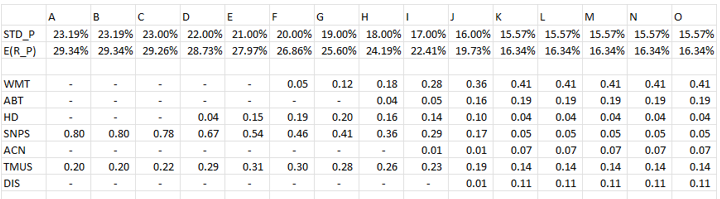 Using RichKat, we determined the Efficient Curve (shown on the right). The Efficient Curve depicts the optimal risk to reward relationship. For example, if you want to build a portfolio from the seven stocks recommended by US News & World Report and want the lowest possible volatility (15.57%), you should expect a return of 16.34% and only hold two stocks, 80% SNPS and 20% TMUS. Conversely, if you want to build the highest possible return portfolio, what risk should you expect? The answer is the right tip of the curve which shows a volatility of 23.19% and an expected return of 29.34%. The “optimal” portfolio as indicated by the largest Sharpe ratio (1.243) is a portfolio with expected return of 26.86% and a volatility of 20%. (All data referenced in this paragraph shown in the table below).