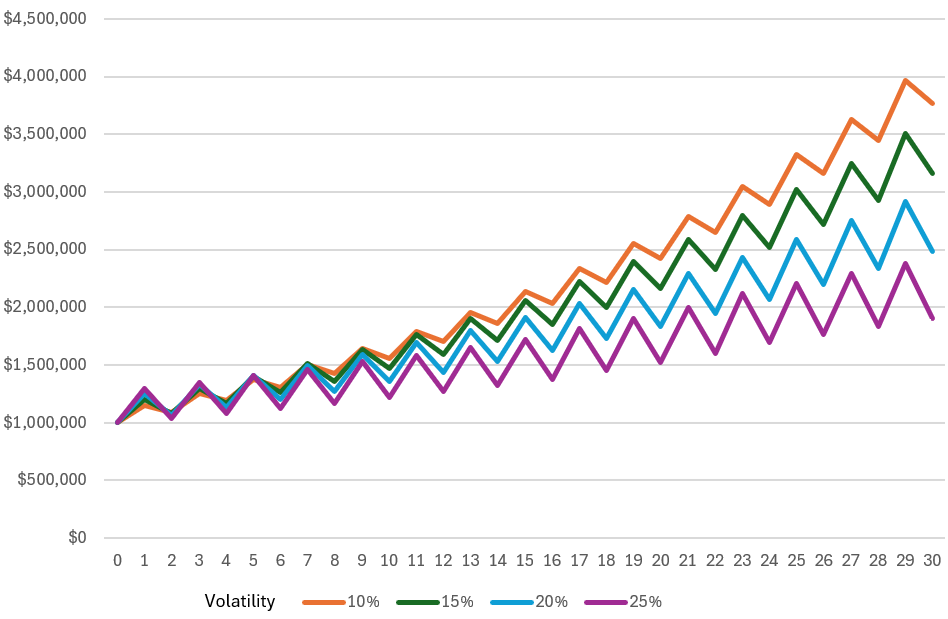 In the short run, there’s not a wide difference in outcomes; notice how after year three years or so the portfolios are tracking fairly closely. But after about the tenth year they begin to diverge quite a bit. And after 30 years, the differences are dramatic. The 10% volatility portfolio has more than $3.7mil but the 25% volatility portfolio has only $1.9mil.
